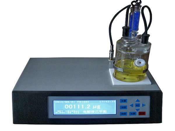 步驟一:處理電解池。把微量水分測定儀的電解池輕輕晃動幾下,使池瓶內壁上的水分被電解液充分吸收,然后把電解池放入夾持器中,打開攪拌開關,調整攪拌速度,使液面形成一個小的漩渦;把測量電極插頭和電解電極插頭插入主機的相應插座上,并使其接觸良好,打開電解開關。說明:在過碘的狀態(tài)下,測量信號指示燈、電解信號指示燈的綠色燈是全部熄滅的,只分別亮一個紅燈,并且數字顯示器不計數。