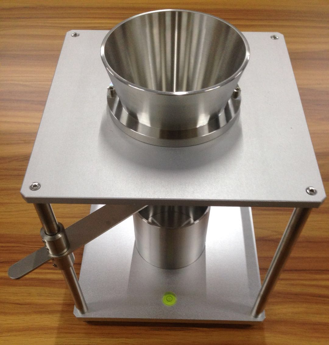 (1)漏斗 可用不銹鋼、塑料、木或其他合適的材料制成。和流動粉體接觸的所有表面應該光滑,且不允許由于粉體的流動而產(chǎn)生靜電。測定自由流動粉體時,漏斗下口的內(nèi)徑采用40mm,上口內(nèi)徑采用108mm,高度采用l30mm;而測定有結塊趨勢的粉體時,下口內(nèi)徑采用60mm,上口內(nèi)徑采用112mm,高度采用100mm。