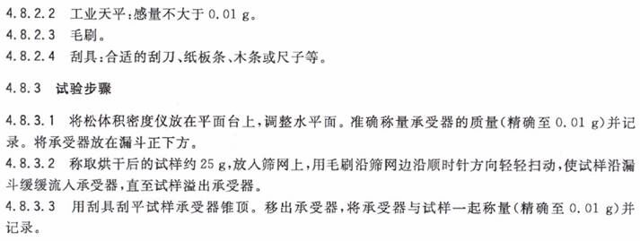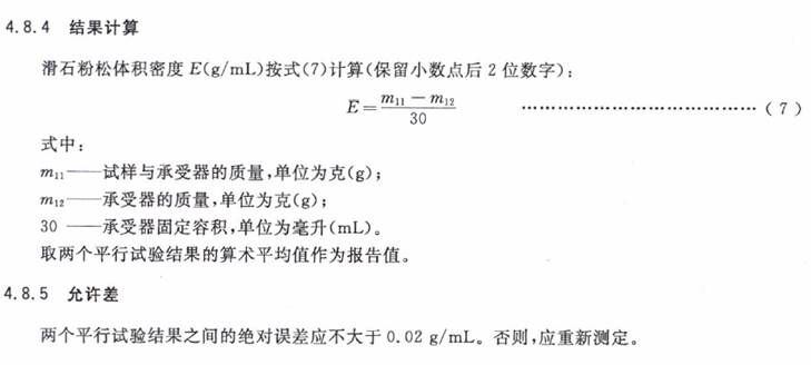 4.8 滑石粉松體密度測定方法 4.8.1 方法原理概要: 滑石粉松體密度是指滑石粉再松散狀態(tài)下(能自由流動),一定容積的滑石粉所具有的質(zhì)量。