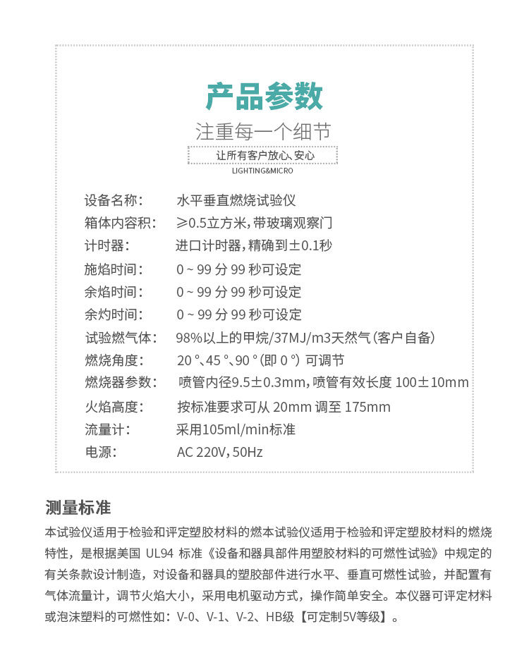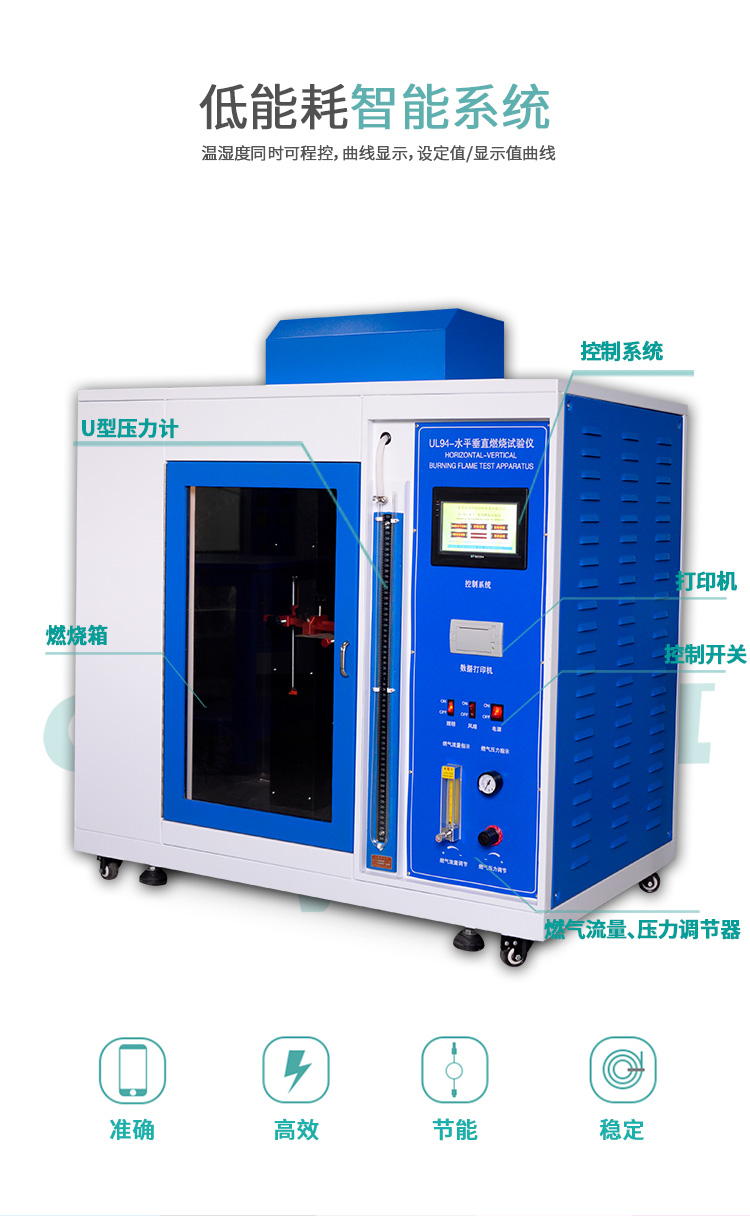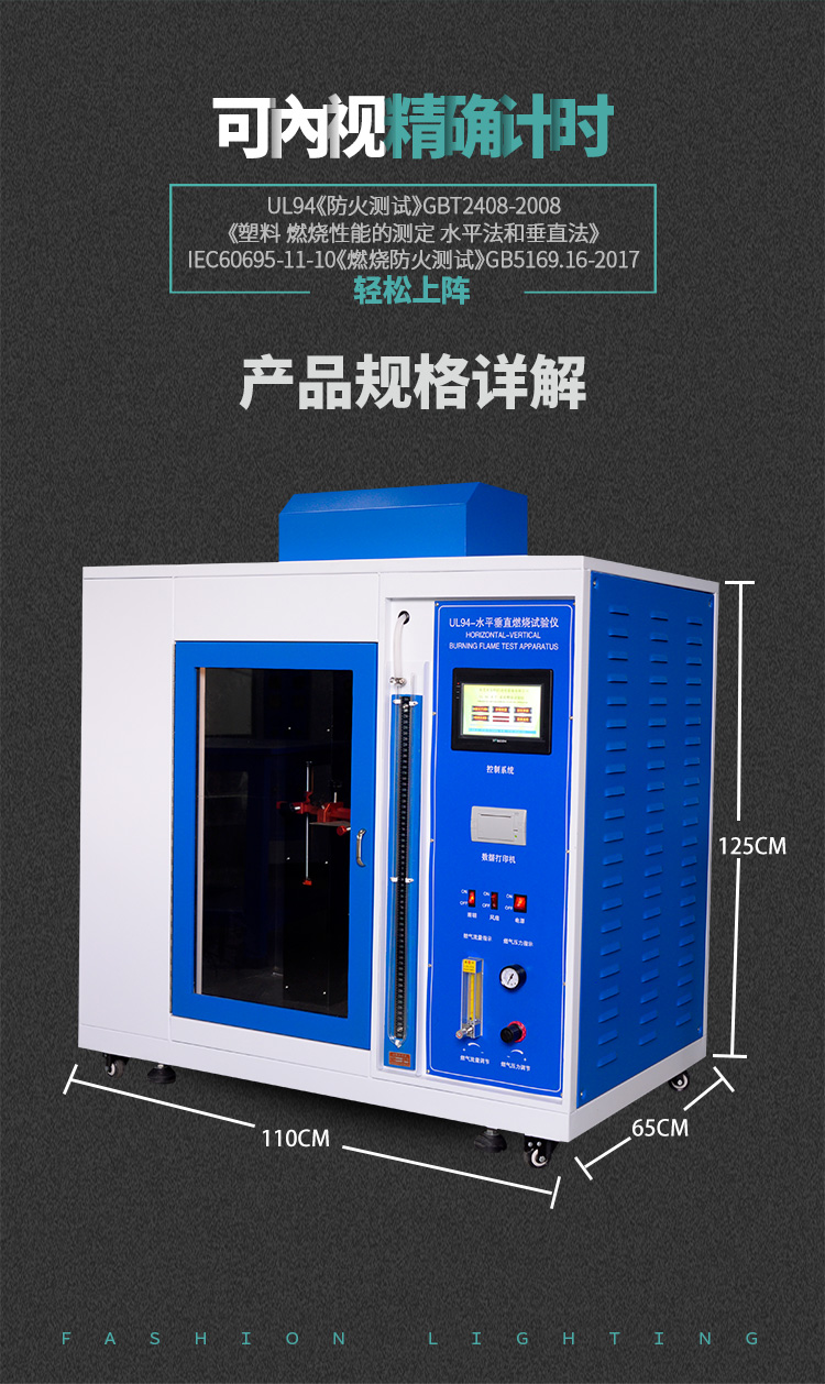 產(chǎn)品簡(jiǎn)介: 1、水平垂直燃燒試驗(yàn)主要參照UL 94-2006、UL1581\UL13\UL444\UL1655\CAS之FT-1.、IEC 60695-11-4 、IEC 60695-11-3、GB/T5169-2008系列等標(biāo)準(zhǔn)采用規(guī)定尺寸的本生燈 (Bunsen burner) 和特定燃?xì)庠?