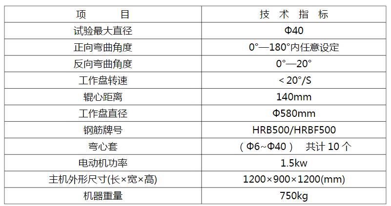 該試驗(yàn)機(jī)是對(duì)鋼筋進(jìn)行冷彎試驗(yàn)和平面反向彎曲試驗(yàn)的一種工藝設(shè)備。其主要參數(shù)符合GB/T1499.2-2007《鋼筋混凝土用圓鋼第2部分:熱軋帶肋鋼筋》和YB/T5126-2003《鋼筋混凝土用鋼筋彎曲和反向彎曲實(shí)驗(yàn)方法》中的有關(guān)規(guī)定。