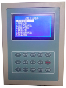 最后兩行是操作提示,其中第一行反白顯示,表示默認(rèn)的是第一行,按[↑]、[↓]鍵可在多個(gè)選項(xiàng)里變換,這些選項(xiàng)都是前一步選擇所需要的參數(shù),前一步的選擇不同,本屏選項(xiàng)的內(nèi)容和數(shù)目也不同。用[↑]、[↓]鍵選中某個(gè)選項(xiàng),則該選項(xiàng)反白顯示,這時(shí)按[設(shè)置]鍵,則該選項(xiàng)內(nèi)容的最后一位閃爍顯示,表示該位可以修改,按[↑]、[↓]鍵則該位在0-9之間變化,按[←]鍵則前移一位閃爍顯示,該項(xiàng)的內(nèi)容修改完畢后按[設(shè)置]鍵,則數(shù)字停止閃爍,整個(gè)參數(shù)項(xiàng)繼續(xù)反白顯示,這時(shí)按[↑]、[↓]可以選擇其他參數(shù)項(xiàng)。當(dāng)所有的參數(shù)修改完畢后按[復(fù)位]鍵,則保存剛才所有的修改并進(jìn)入到正常試驗(yàn)狀態(tài)。