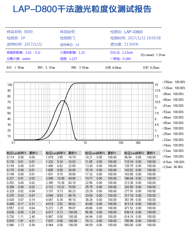 顯示模板 | 粒徑區(qū)間求百分比,以滿足不同行業(yè)對粒度測試的表征方式。徑距、一致性、區(qū)間累積等等 |