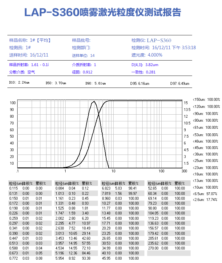超寬量程:LAP-S360的設計量程達到了0.1μm~270μm,能夠滿足噴霧設備領域內絕大多數(shù)用戶的粒度測試需求。