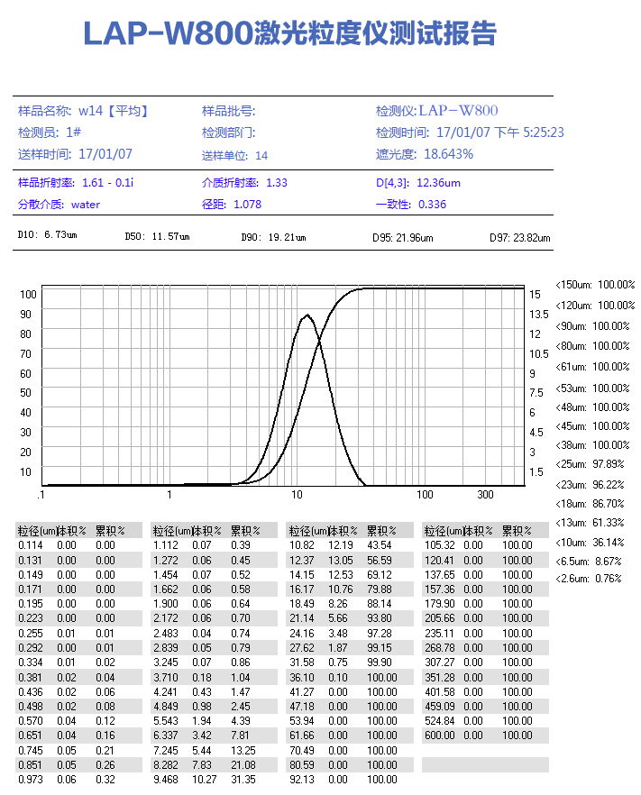 顯示模板 | 粒徑區(qū)間求百分比,以滿足不同行業(yè)對粒度測試的表征方式。徑距、一致性、區(qū)間累積等等 | |